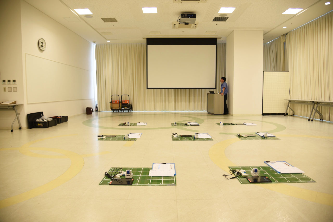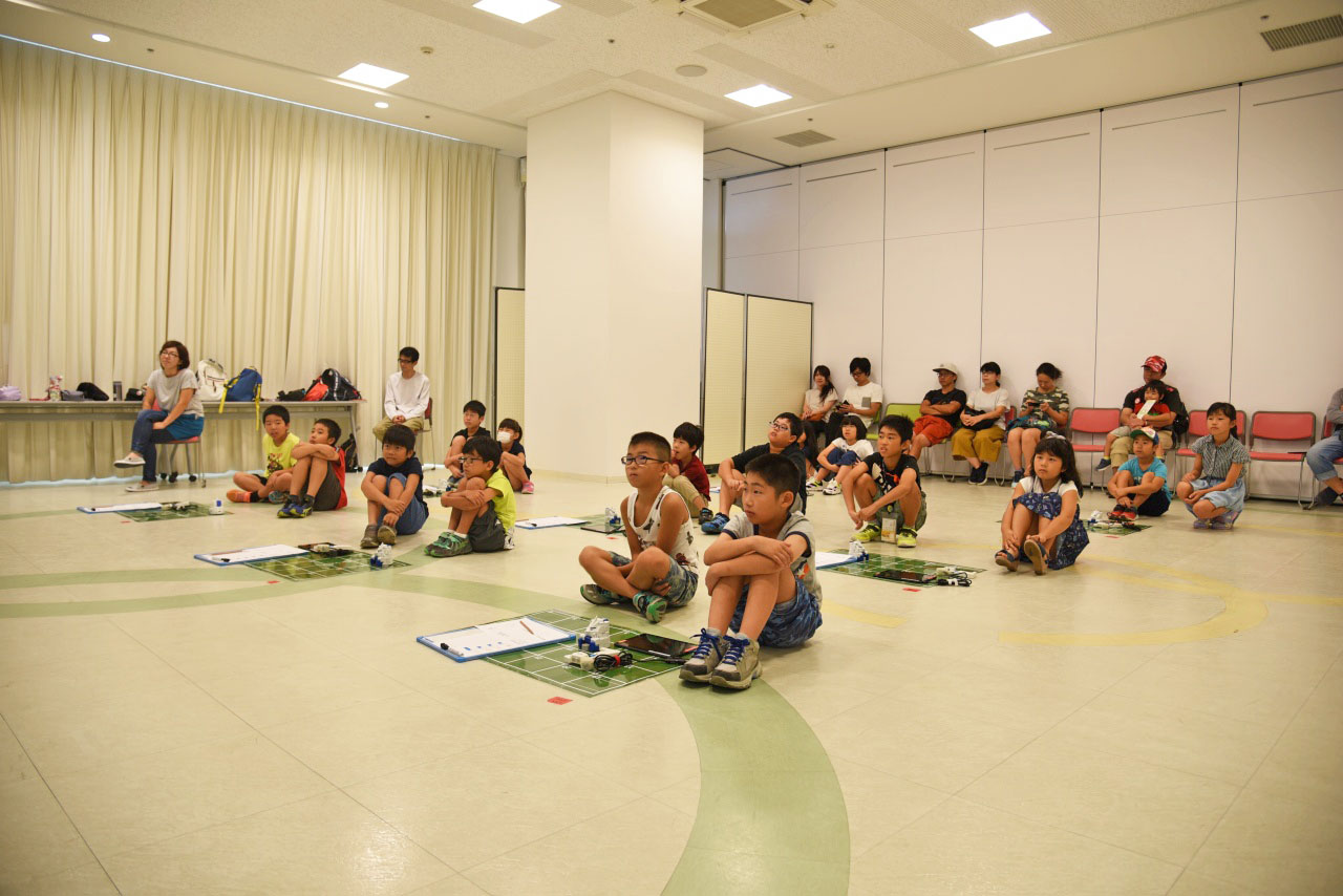 ★受付を終えた子供たちは決められた席に移動します。さっそくロボットに興味津々。