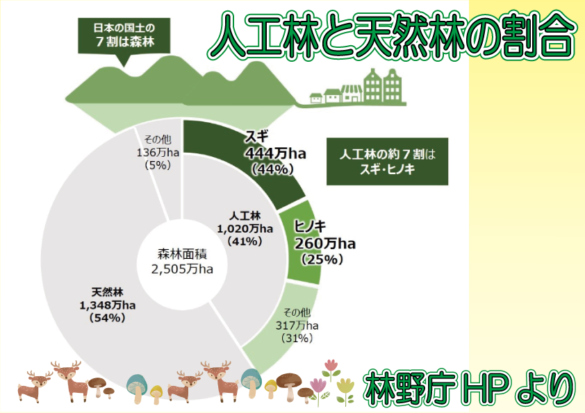 ★日本の国土の7割が森林です。また、そのうちの4割が人工林。人工林とは人が山に針葉樹を植えた森です。人工林は定期的に手入れをしないといけないのですが・・