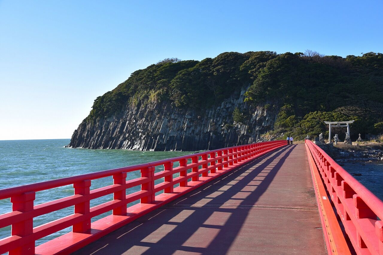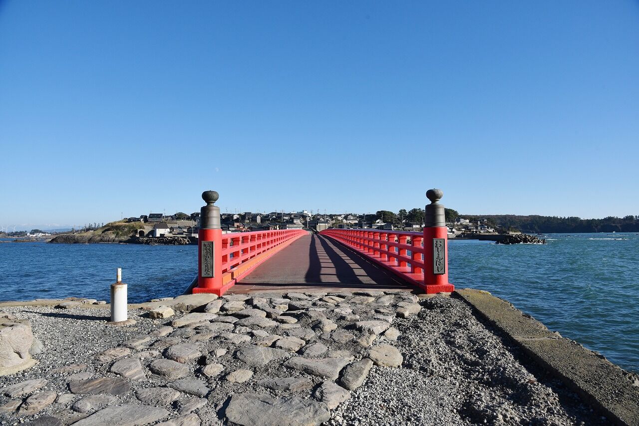 赤い長い橋が架かっていて無料で渡る事が出来ます。