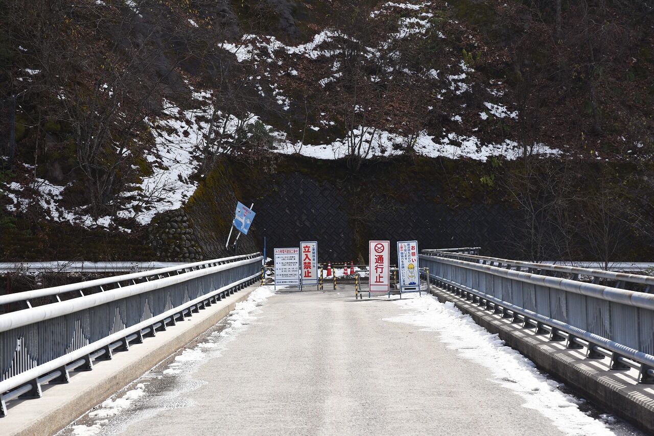橋の脇にも雪が溶けずに残っていて、橋の先は通行止めになっていました!