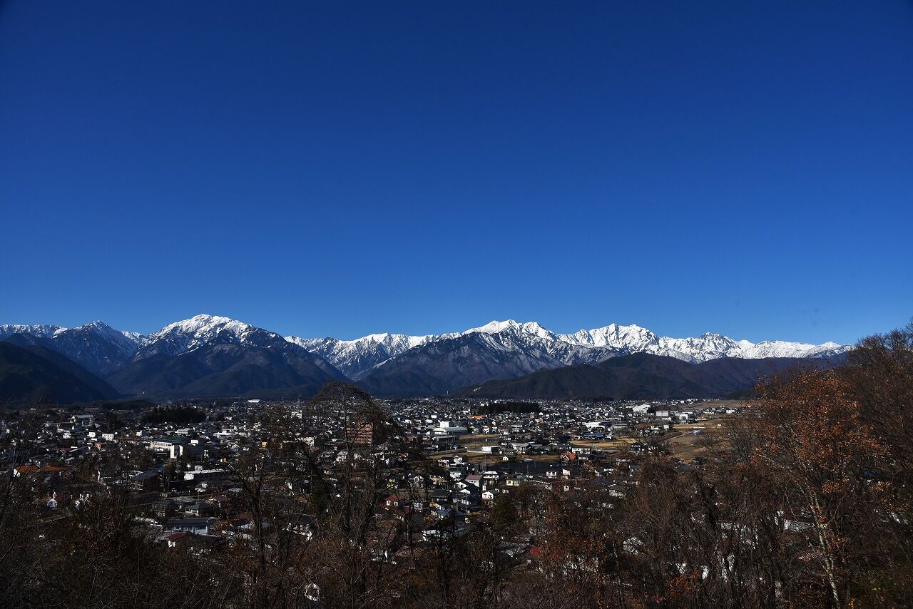 大町市の展望台から見た雪山。
