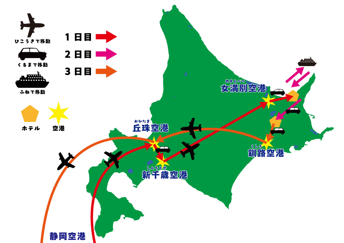 初日は静岡空港から丘珠空港へ、そのあと新千歳空港までタクシーで移動して女満別空港まで飛行機で移動、女満別空港からレンタカーで知床まで行って一泊しました。