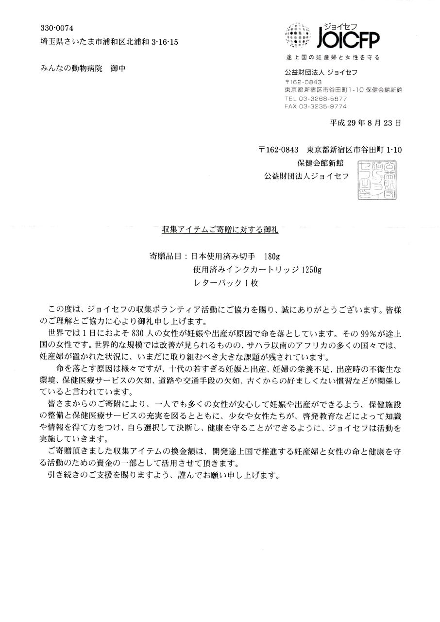 先日の発送分の感謝状がジョイセフから届きました。