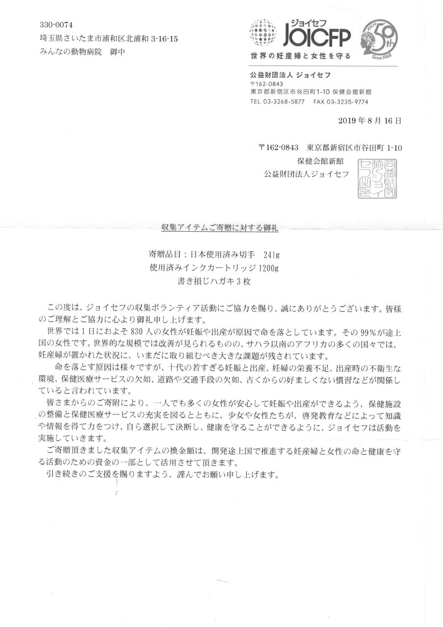 古切手・使用済みインクカートリッジ 6月発送分お礼 2019年08月23日 いつもご協力ありがとうございます。今回も沢山の使用済みインクカートリッジと使用済み切手をジョイセフへお送りできました。また、ジョイセフでは新たに古本・古DVD等の回収も始めたそうです。詳細は下記チラシをご覧ください。こちらも併せてご協力いただけると幸いです。当院から送った皆様のご協力実績(2019.8月現在) 使用済み切手 3.6㎏ 使用済みインクカートリッジ 14.6 ㎏ 書き損じはがき 126 枚