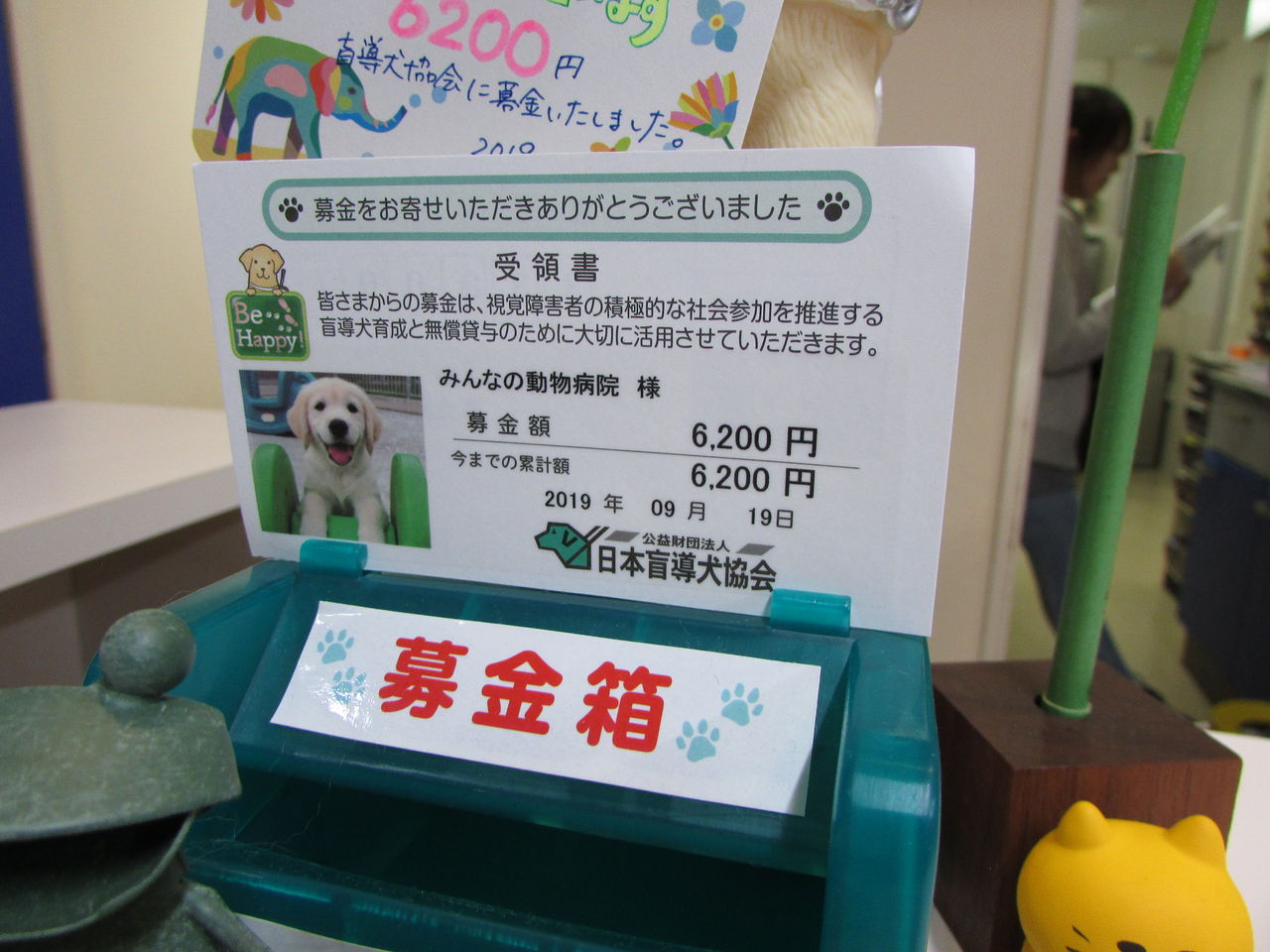 盲導犬募金 振込のご報告 2019年09月20日 受付脇に置いてあります、日本盲導犬協会の募金箱に相当の量が貯まっておりましたため、昨日振り込んでまいりました。(端数は募金箱内に残してあります)昨年12月に設置しましたが、6200円もありました。皆さま、沢山のご協力ありがとうございました!今後とも、よろしくお願いいたします。