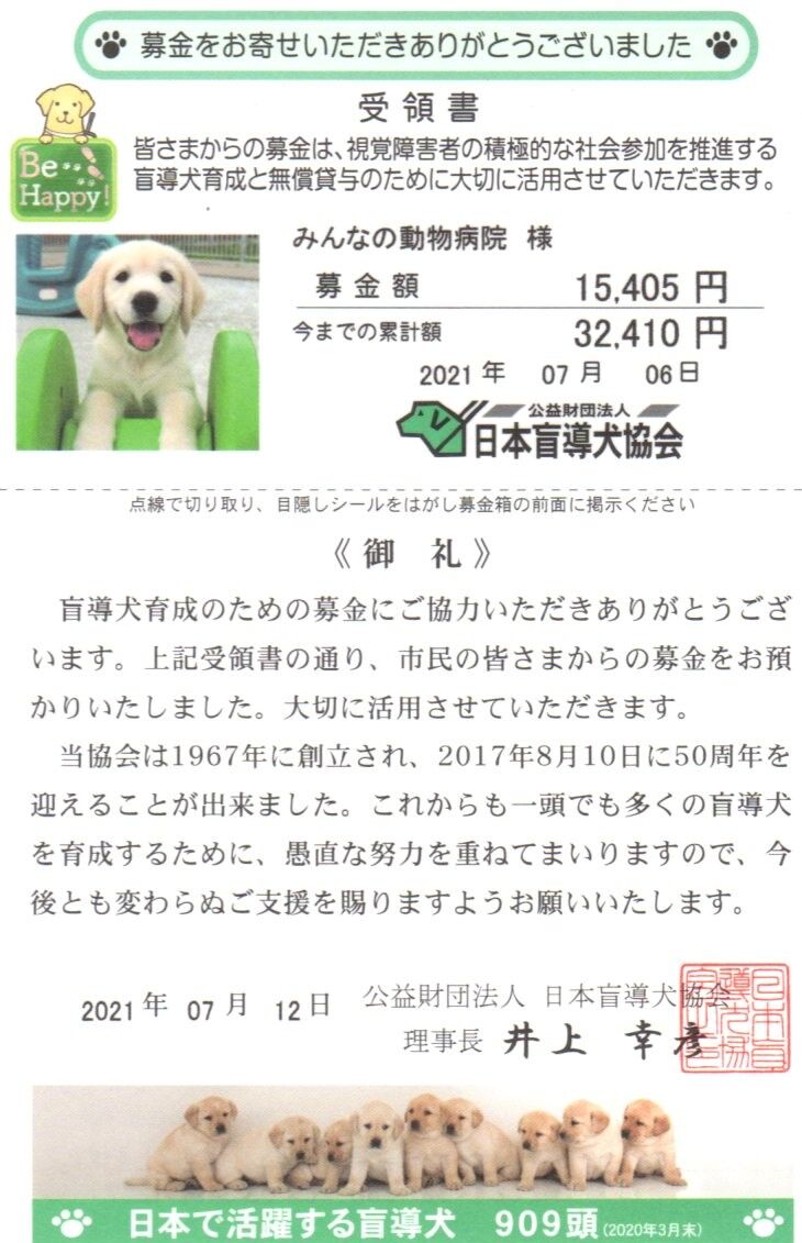 盲導犬募金 振込のご報告 2021年07月06日 受付に設置しております日本盲導犬協会の募金を先日振り込んで参りました。今回は過去最高額の15405円の寄付が出来ました。沢山のご協力ありがとうございました!今後とも、よろしくお願いいたします。