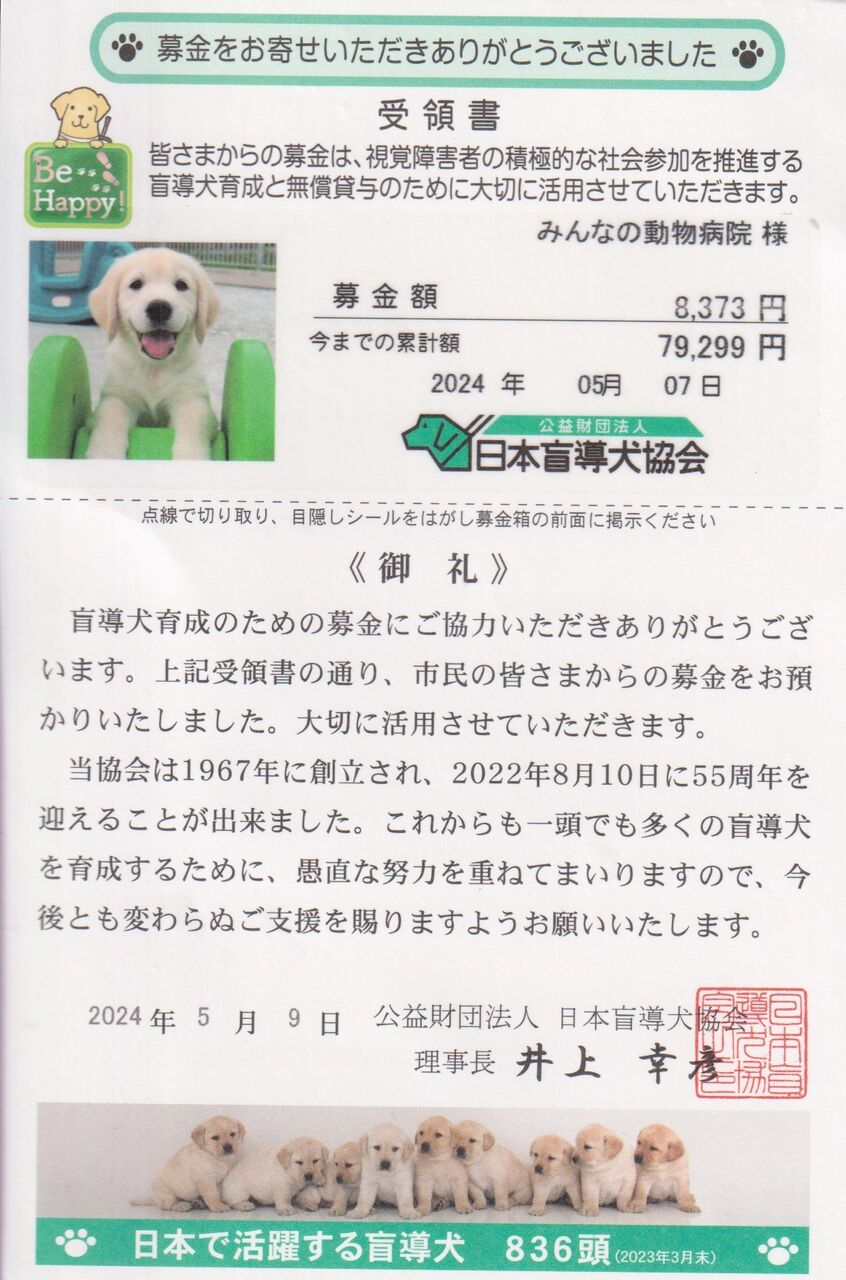 盲導犬募金 振り込みのご報告 2024年05月13日 先日、受付に設置しております日本盲導犬協会の募金を振り込んで参りました。今回は8373円の寄付が出来、総額で79299円の皆さまのお気持ちをお送りできています。いつも沢山のご協力ありがとうございます。今後とも、よろしくお願いいたします。