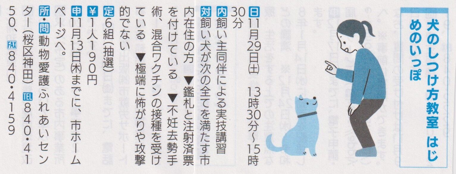 さいたま市主催 犬同伴の実技講習 2025年10月28日 今月の市報に、下記のイベント案内が載っておりました。リーズナブルに情報を聞ける良い機会かと思いますので、ご興味ある方は担当部署へ連絡をしてみてください。 「しつけ/トレーニングのおはなし」カテゴリの最新記事 < 前の記事次の記事 >