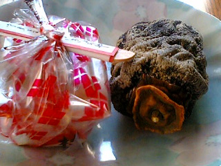 ...自家製白ワインと枯露柿、信玄もちのお届け物ですぅ。(。・O・。)ノ 聞かんでも、どこからかわかりそうな取り合わせですねぇ。