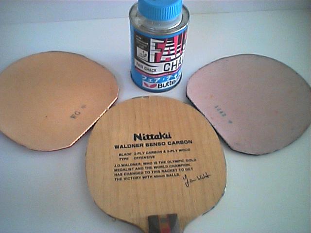 そこで卓球屋さんに行きましたら、揮発性のは体に害を及ぼすので、現在は水溶性接着剤になっとるとのこと。