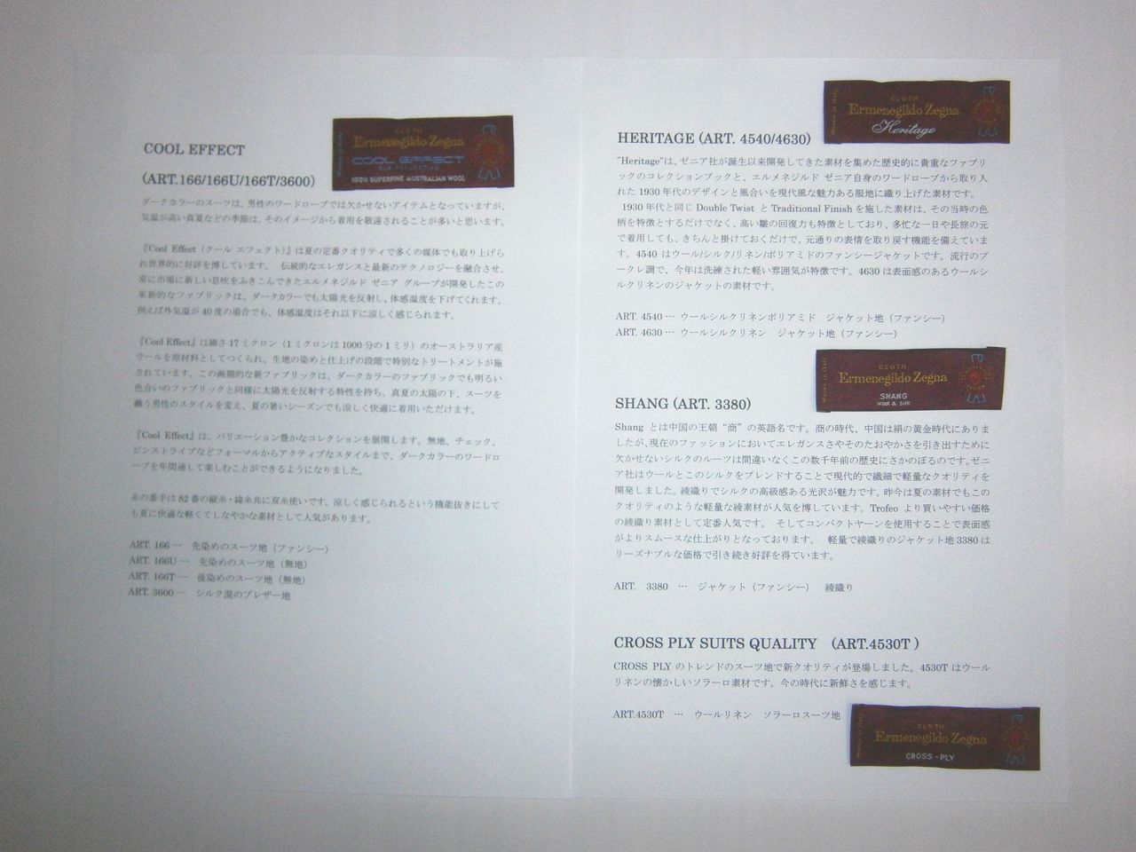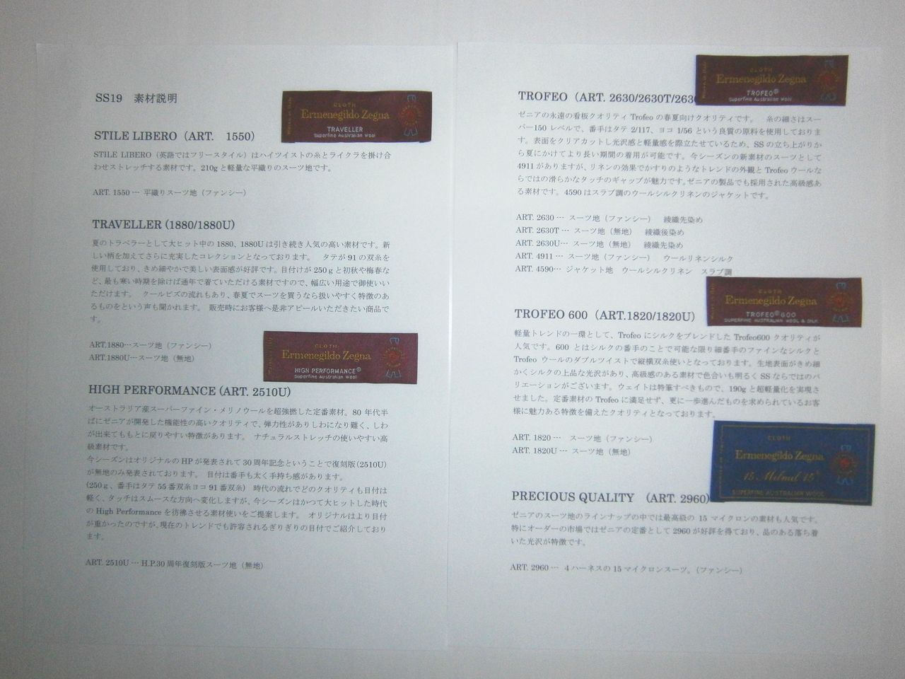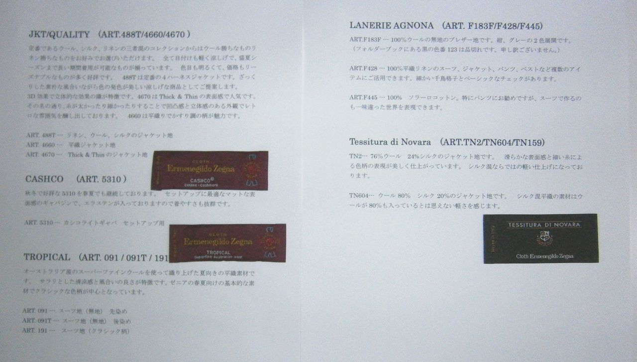 2019年02月23日 SS19ゼニアの素材説明です Ermemegildo Zegua2019年春物・夏物の素材説明です。年々素材は進化しております。トラベラーは人気で春先には最適な素材です。クールエフェクトは着た瞬間に体感温度を下げてくれて、涼しく感じられます。ROFEOやTROPICALなども人気です。ゼニアで最高級の品のある落ち着いた光沢が特徴の15Milmil15なども新柄揃っております。下の写真の内容はもちろん生地も店頭でいつでもご覧いただけます。