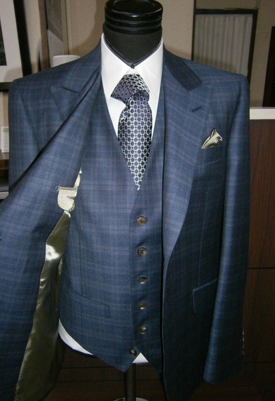 2020年10月30日 ゼニア スリーピス ゼニア ”TROFEO”の スリーピス です。光沢のある紺系のチェック柄。裏地はゼニアのグリーン系の裏地を選択。胸ポケットの袋地も裏地を使用、ポケットチーフ代わりにOKです。