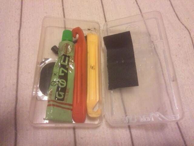 パンク修理に必要な、タイヤを外すレバー、紙ヤスリ、穴をふさぐパッチ、パッチを貼るゴムのり、これら一式がパッケージされたパンク修理キットがホームセンター等で売っています。