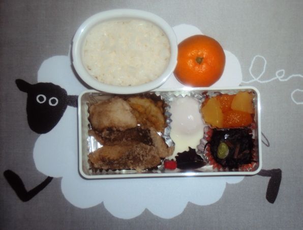 カラスカレイの唐揚げ、レンコンの挟み揚げ、ぽっとん卵、ひじき、フルーツ缶詰、みかん、ごはん
