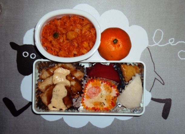 チキンカツ、かに玉、ウインナー、スナックエンドウ、しそ昆布、なし、みかん、明太ふりかけ、ごはん