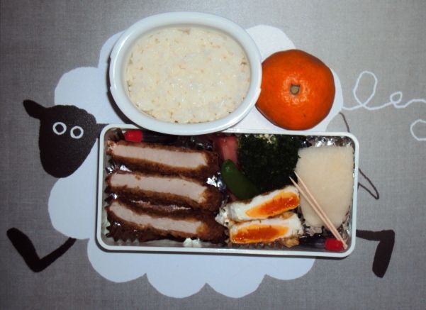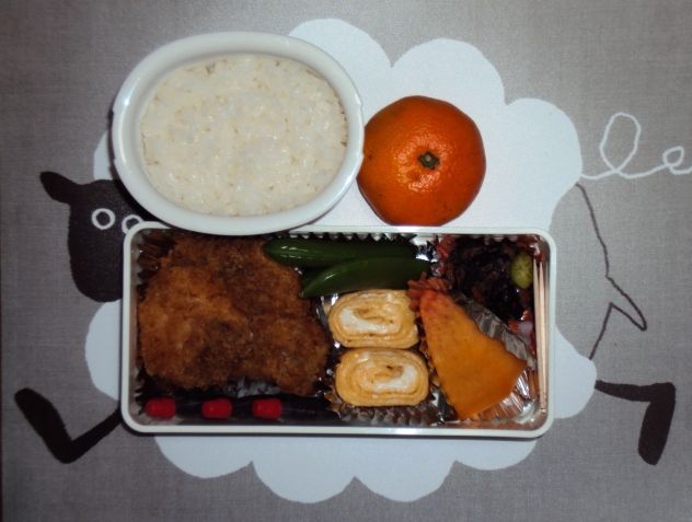 ミルフィーユカツ、オムレツ、チーズ竹輪、ウインナー、スナックエンドウ、ブロッコリー、りんご、みかん、ごはん