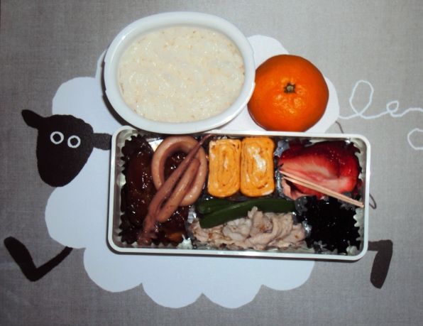 鶏の照り焼き、イカの甘辛煮、卵焼き、豚肉のごまドレ、スナックエンドウ、しそ昆布、いちご、みかん、ごはん