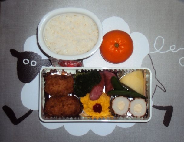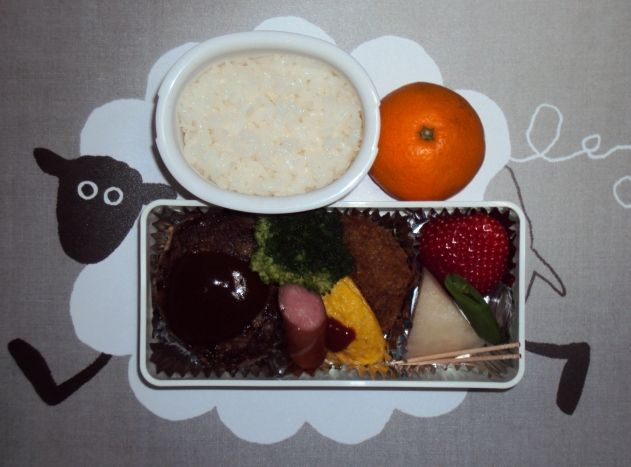 ハンバーグ、ウインナー、オムレツ、コロッケ、ブロッコリー、スナックエンドウ、なし、いちご、みかん、ごはん