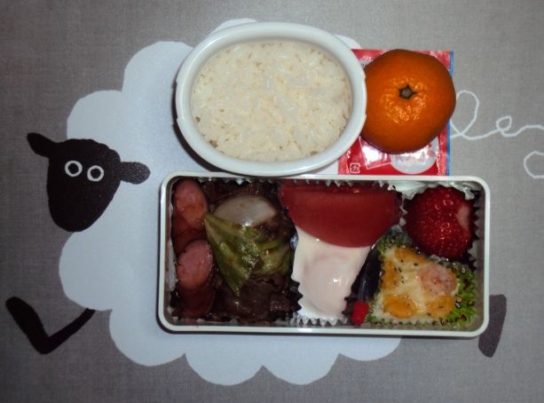 焼き肉・ウインナー・キャベツ、ぽっとん卵、えびグラタン、トマト、いちご、みかん、ごはん