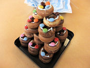 フロアーに甘い香りが広がっていました。可愛いドーナツが焼けました。倒れないようにチョコレートをつけて積み重ねて色とりどりの小さなチョコレートで飾り付けて出来上がりました。スカイツリーの声も聞こえてきました。