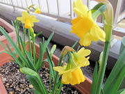 こちらのフロアーのベランダには黄色の水仙が春の日差しを浴びて太陽を追って花を開いています。