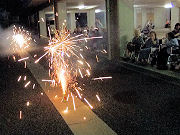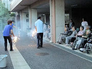 夏の夜のお楽しみです。夕食をすませて涼しい風になってきました。まだ明るさが残っていましたが外での花火ということに皆さんお喜びでした。