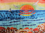 風景画の貼り絵ができました。海に沈む秋の夕日が水面に輝いて映えています。