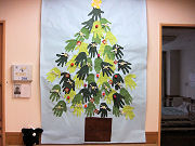 このツリーは皆さんの手形です。ご自分の手を丁寧に形をとって切りました。貼りつけるととても素敵なツリーになりました。