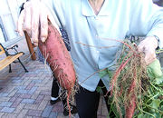 ![]() | 久しぶりの秋空となり、5月に植えた「サツマイモ」の収穫です。土の中に手を入れてお芋を見つけました。 |