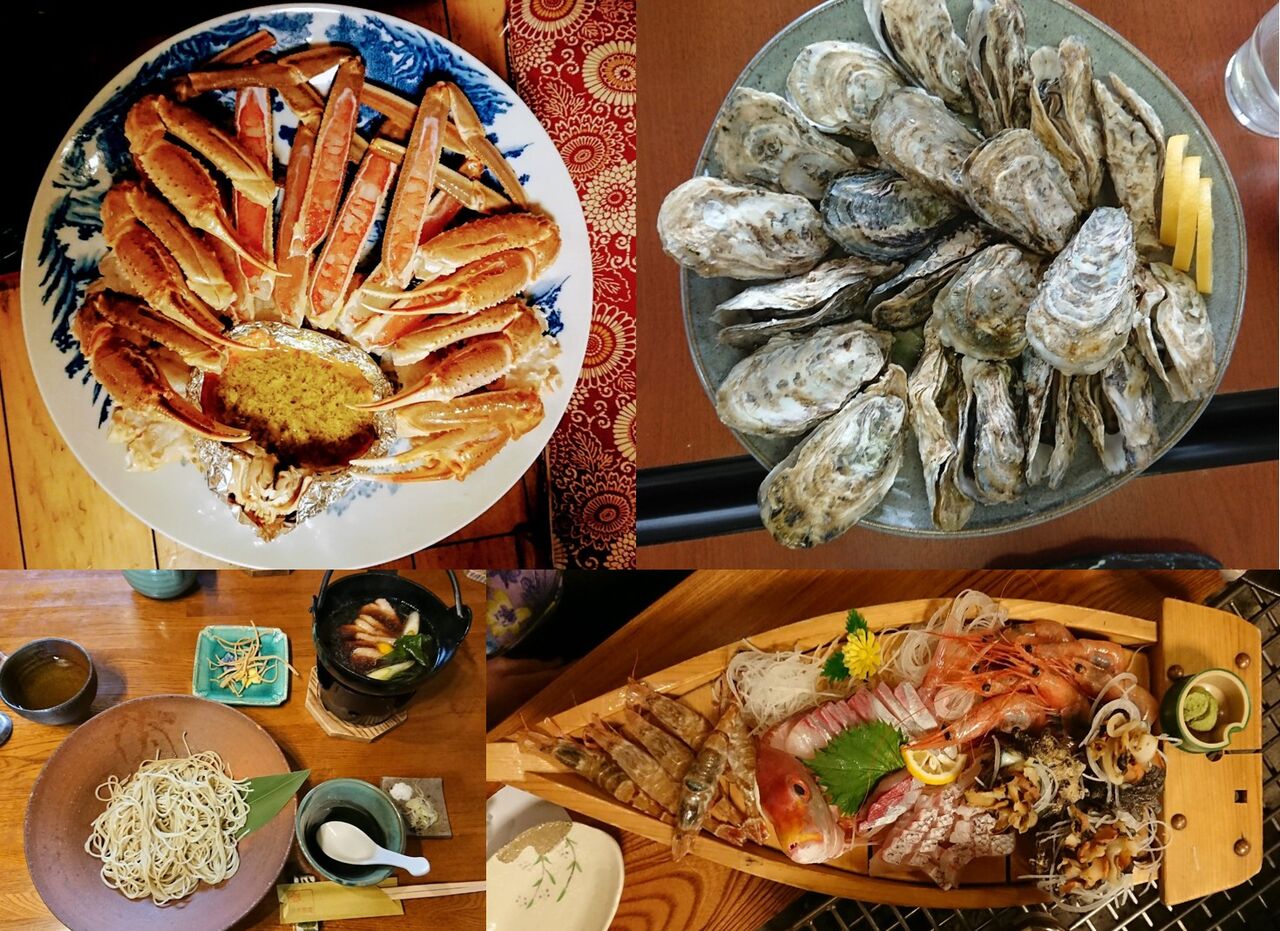 蕎麦、ぜんざい、カニ、エビ、ホタテ、サザエ、刺身盛り、カキ・・等々