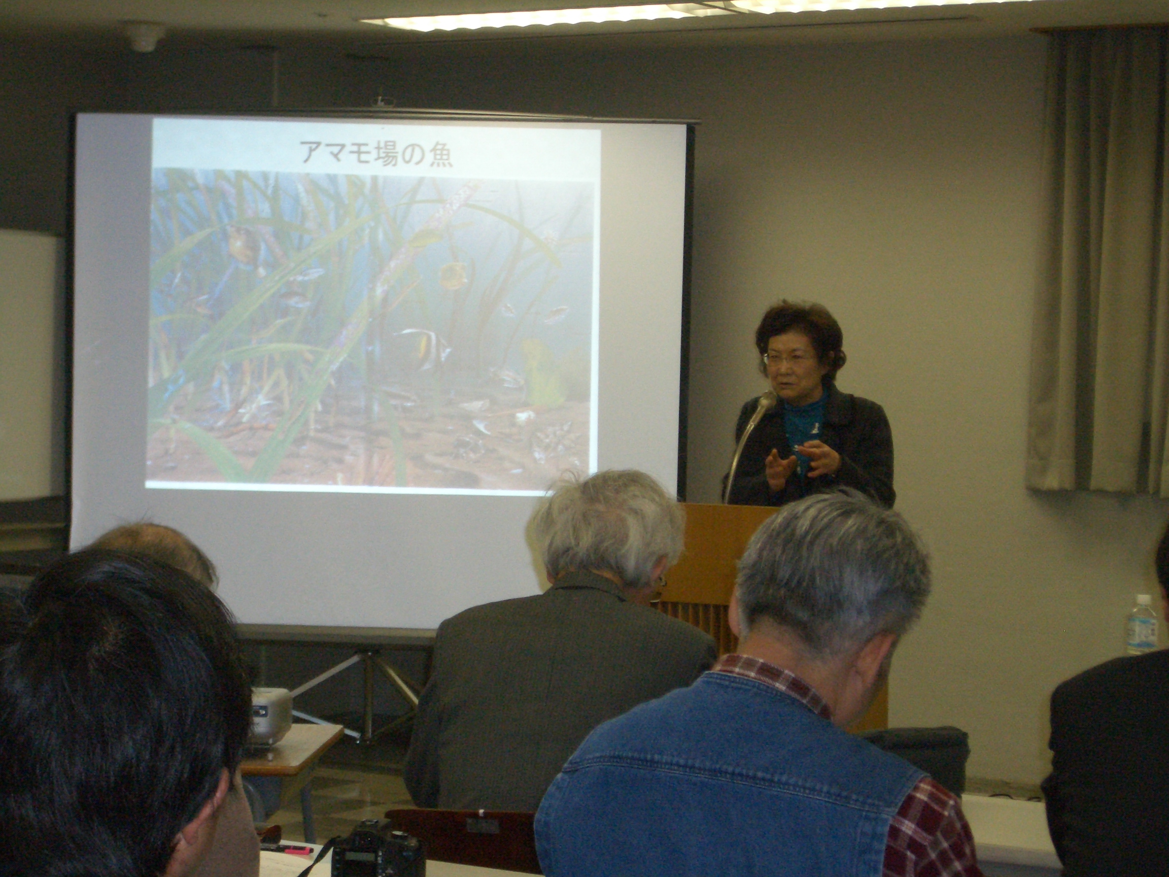 まず、相生啓子先生(特定非営利活動法人 国際湿地保全連合顧問)に「体験学習を通じてアマモ場の重要性を学ぶ」と題した基調講演をいただきました。その後、妹尾護先生(倉敷芸術科学大学)によるアマモ場の再生を目指した海底土壌調査の分析結果報告、塩飽が今年度の海底ごみ調査結果のまとめとアマモ場をフィールドとした体験学習プログラムづくりを目指した財団の取り組みを報告しました。