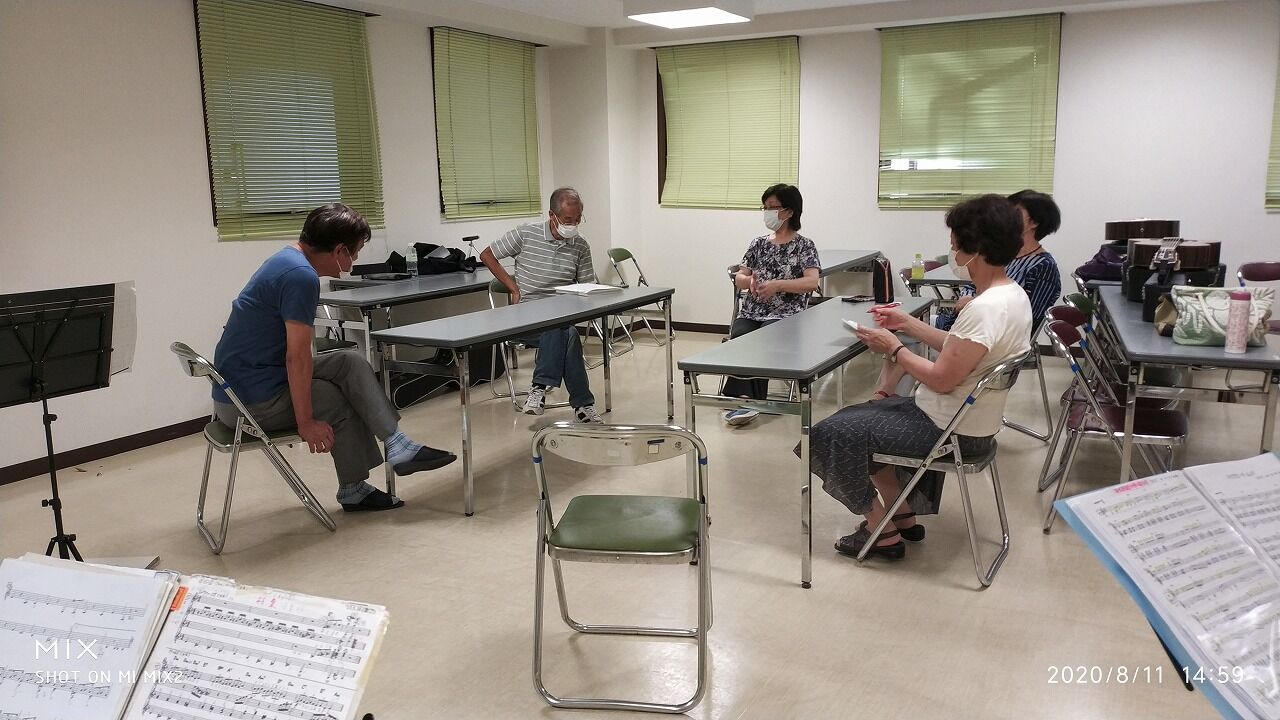 いつもの練習場のエアコンの効いた涼しい会議室で、マスクをして、窓を開けて、ソーシャルディスタンスを保って、もぐもぐタイムもとらず、練習に励みます。