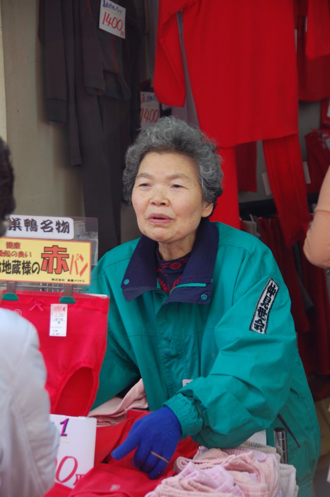 商店街を入ってすぐに、名物赤パン売りのオバチャン。