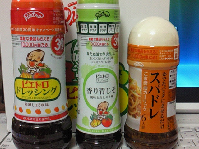 ピエトロの株主優待です。左端の和風しょうゆ味のドレッシングで鶏肉を焼くととてもおいしいの。