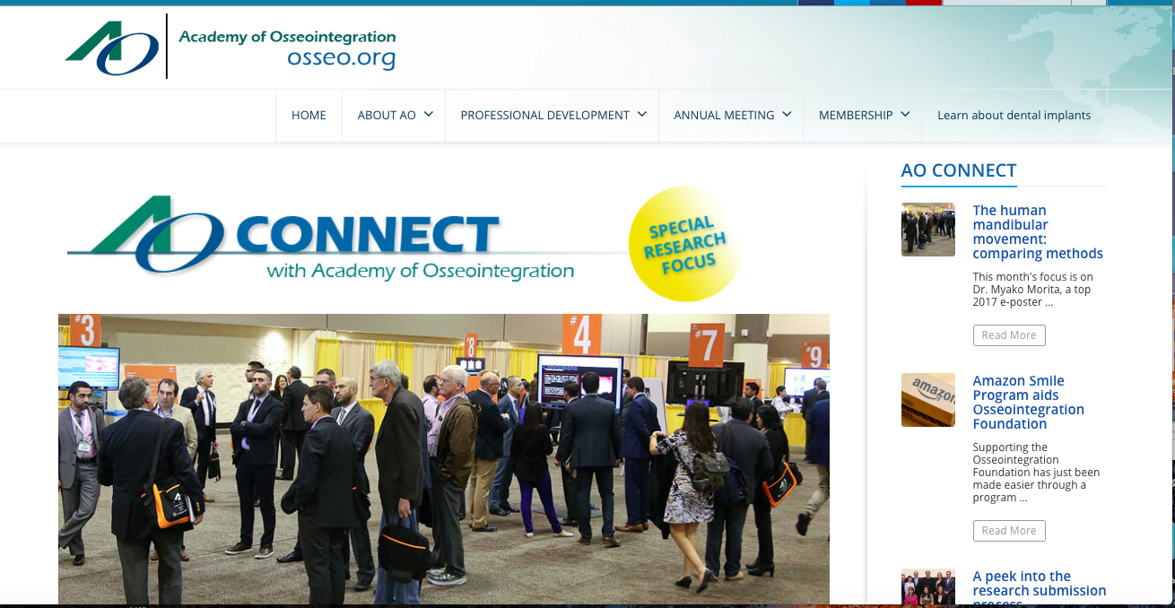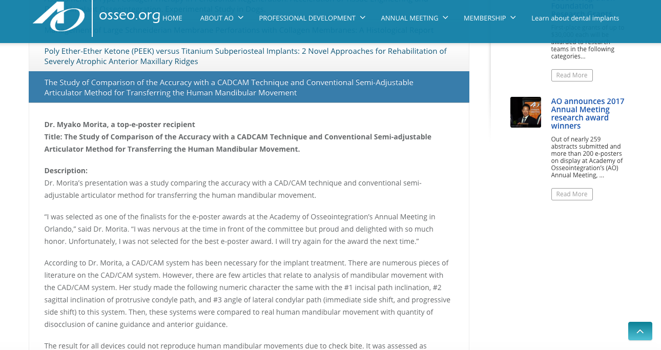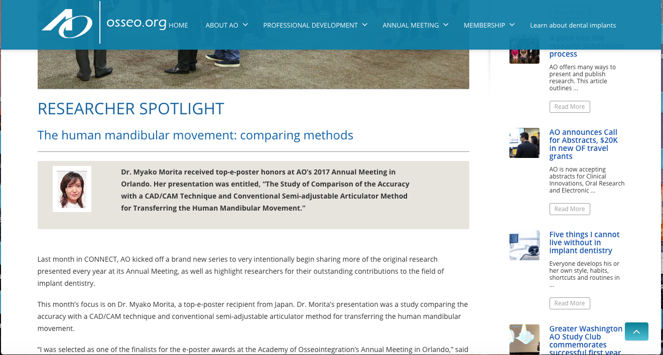 友人の歯科医師に私の論文が、アメリカ最大のインプラント学会であるAO学会のホームページに ”今月のスポットライト” として載っているよ、と教えられて見てみました。