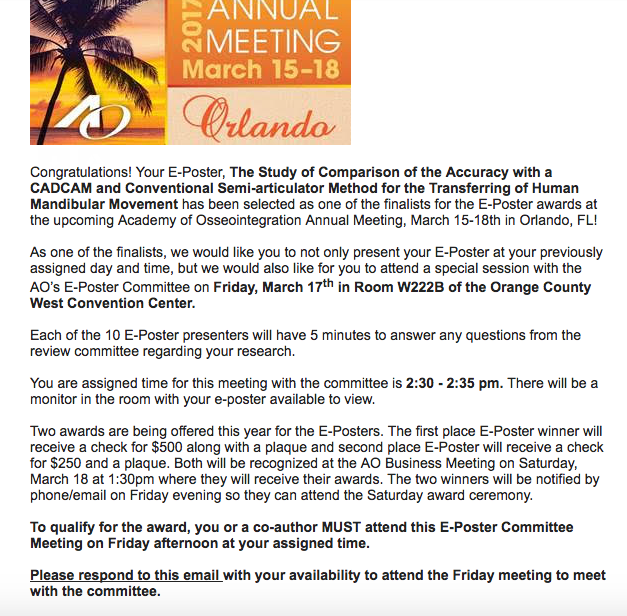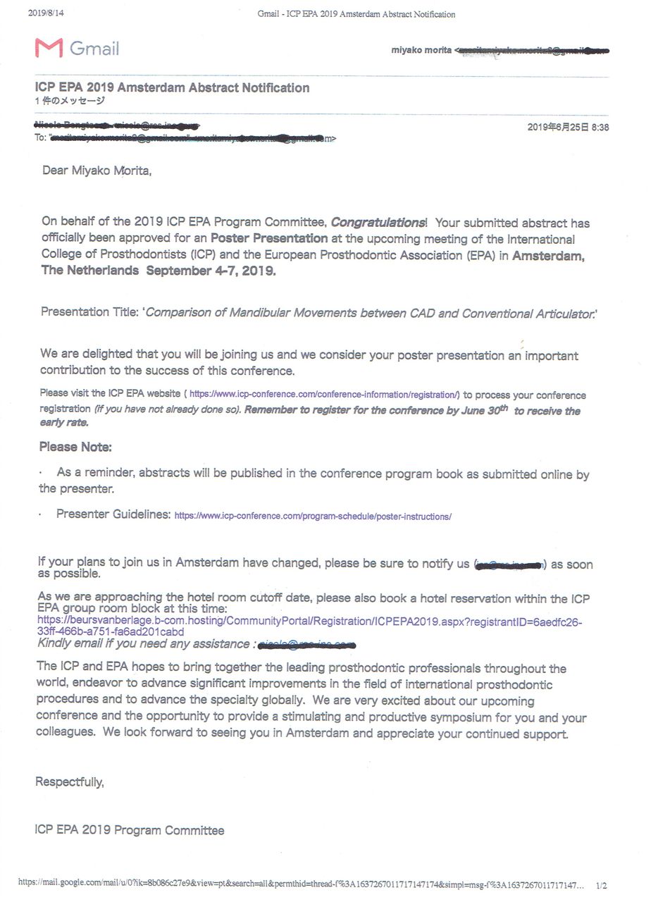 ヨーロッパ補綴学会に抄録文を投稿した後、この様なメールが来ました。
