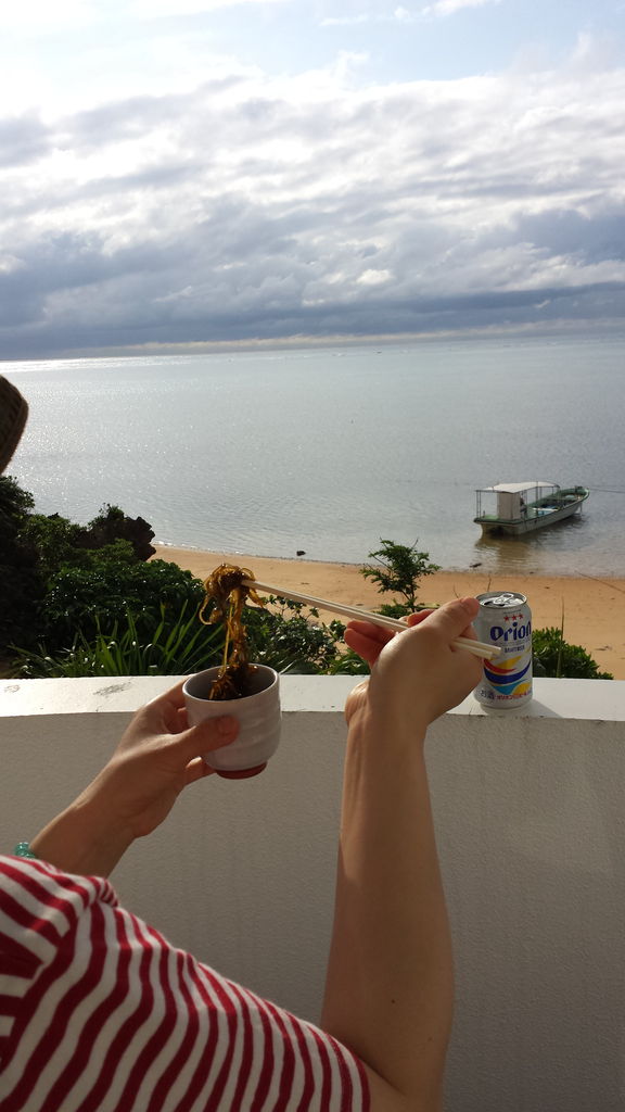 海を見ながら、取れたてのもずくとオリオンビールは格別です!