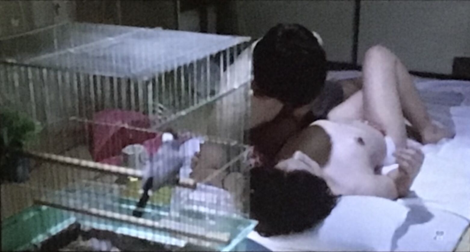 そこで若者と彼に誘われたお姉ちゃんが鳥籠の前でセックスを始めると