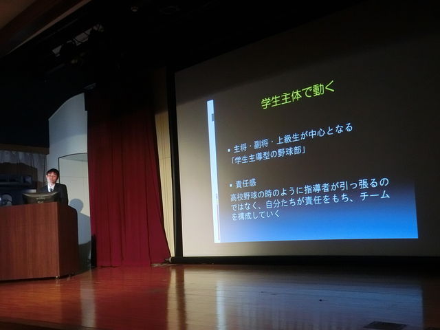 野球部からは、一年生責任者のカツラダ君が、現代社会学科を代表(3名)する一人として、プレゼンテーションを行いました。演題は『甲子園だけが高校野球ではない:野球を通した人間形成』です。