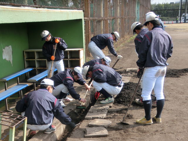 三年生は、トイレ掃除。二年生は、ベンチおよびグラウンド周辺の清掃。一年生は、外野の芝生にたくさん張りついている糸くず集め。