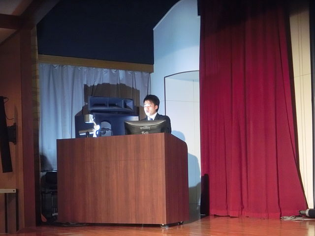 午前のリハーサルでは、資料の修正をするなど、バタバタとしている印象でしたが、午後の本番では、発表者の中では唯一原稿を見ずに、落ち着いて話しておりました。また、自分の言葉で一生懸命に発表する姿は、とても好感がもてました。