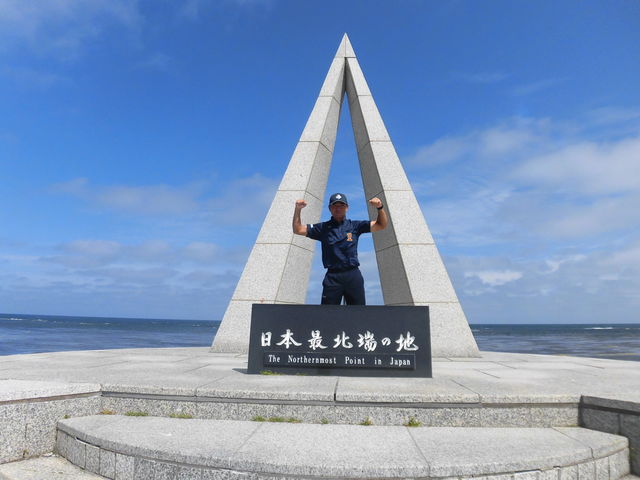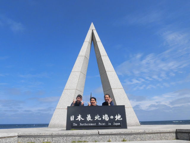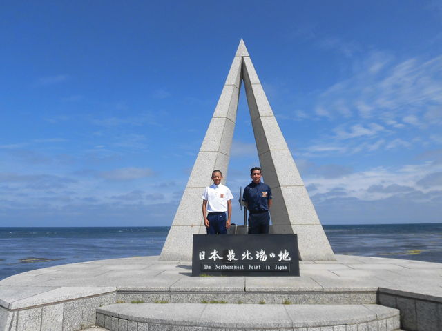 大学生と高校生が一緒に、日本最北端の地・宗谷岬で記念撮影を行います。
