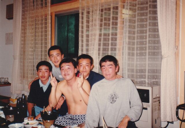 「納会」の席で、三年生の先輩を囲んで平和荘の仲間たち(みんな一年生)と。