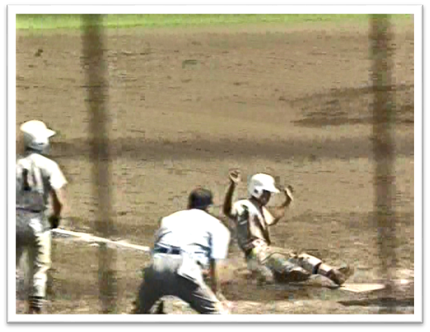 二塁走者の礒山が、判断よく一気に本塁を陥れました(3点リード)。
