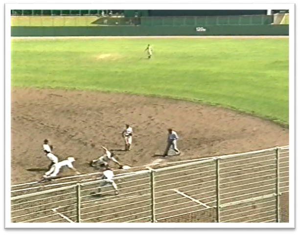 続く六番・エース礒山が、三遊間への適時打で三塁走者の濱を還します(2点差に広げる)。一塁走者となった礒山は、次の投球で、すかさずディレード・スチール(投球がワンバウンドになったため、記録は暴投による進塁)。