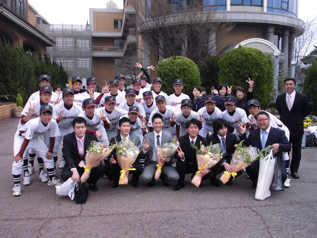 式が終わると、在学生が卒業生(6人)を待ち構えていて、記念品を渡し、最後に記念撮影を行いました。