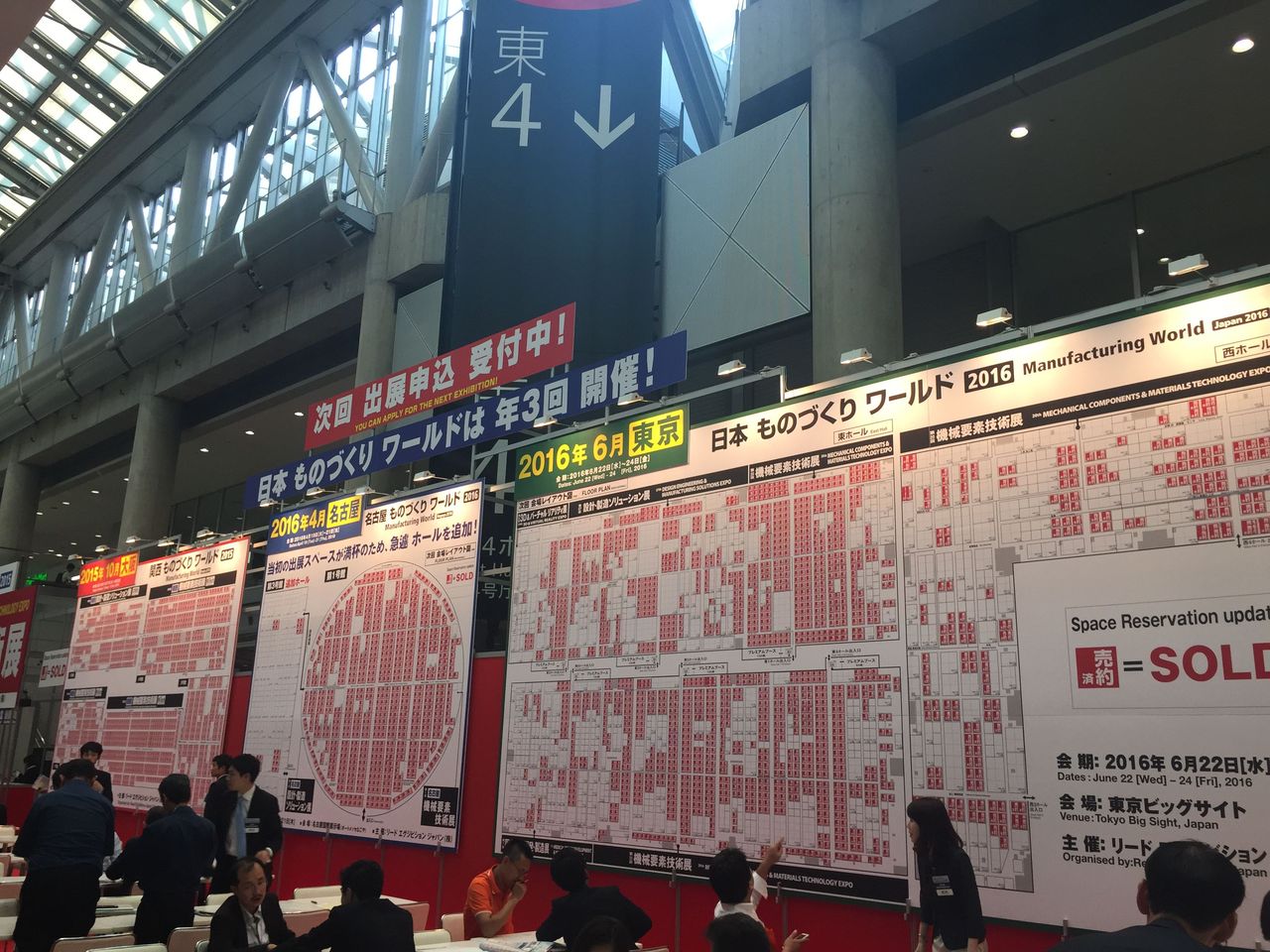 左:分野ごとに4つの展示会が同時開催される形です。右:来年の開催に向け、ブースの予約状況が示されていて、既に大半が埋まっているという状況でした。