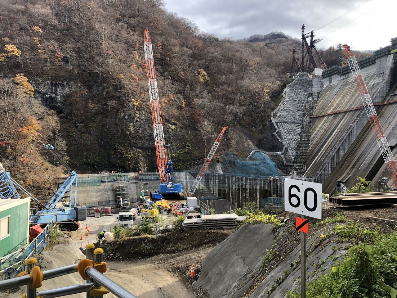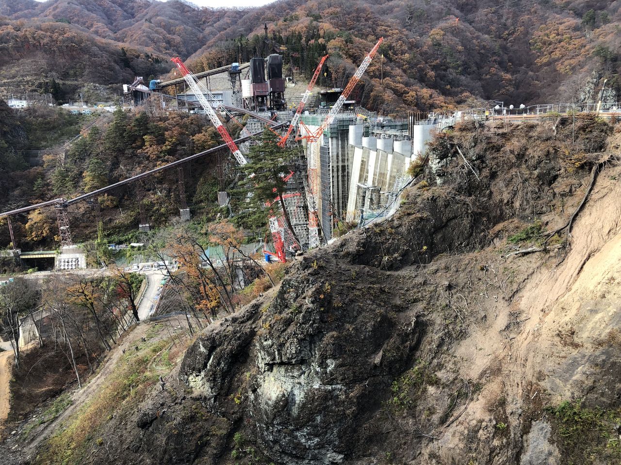 上流側にも回って見学しました。重力式コンクリートダムで堤高116m、総貯水量1億750万㎥を誇る堂々たる姿です。ご覧のように現在コンクリートの打設中ですが、進捗は約9割に達しています。