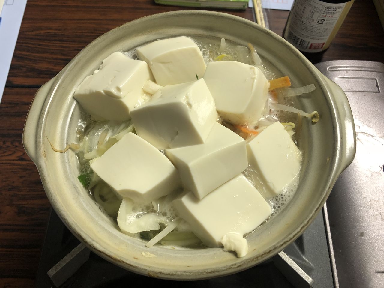 これを一人用の土鍋に放り込み、水を入れて火にかけるだけ。ポン酢でいただきます。野菜と豆腐が多すぎて鶏肉が乗るスペースがありません・・。