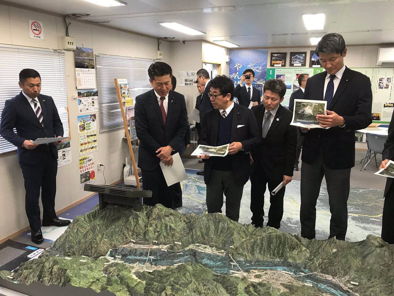 左:国交省工事事務所の担当者から模型を使って説明を受けます。右側のひときわデカイ人は元バレーボール選手の朝日健太郎議員です。右:千葉県から一緒に参加した武田正光青年局長。私とは同期で議場でも隣の席です。ダムの下流側から撮りました。